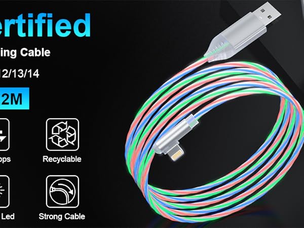 Led Light Up Flowing Iphone Charging Cable Flat Led Lightning Charge Cord Mfi Certified Fast Charge Sync Data Glowing Apple Charger Adapter For Car With Iphone 14 13 12 Pro Max 11 Pro Xr X 8 6ft